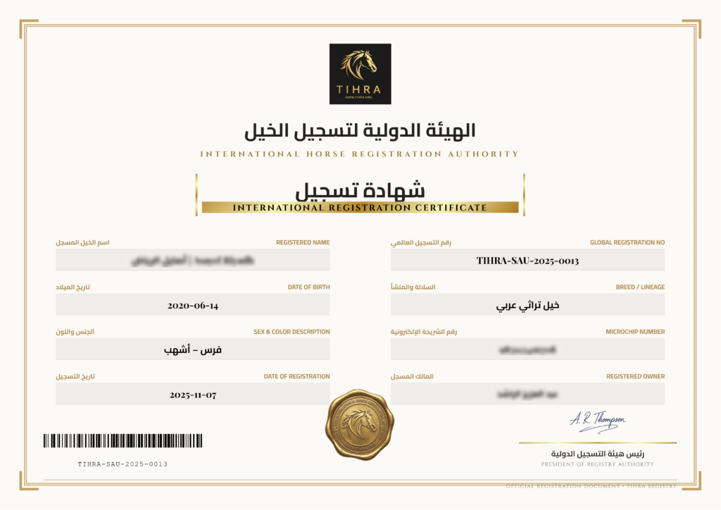 شهادة تسجيل دولية رسمية — وثيقة احترافية تحمل اسم المالك واسم الخيل وبياناته الكاملة ورقم التسجيل الدولي الفريد وختم الهيئة وتوقيع رئيسها.